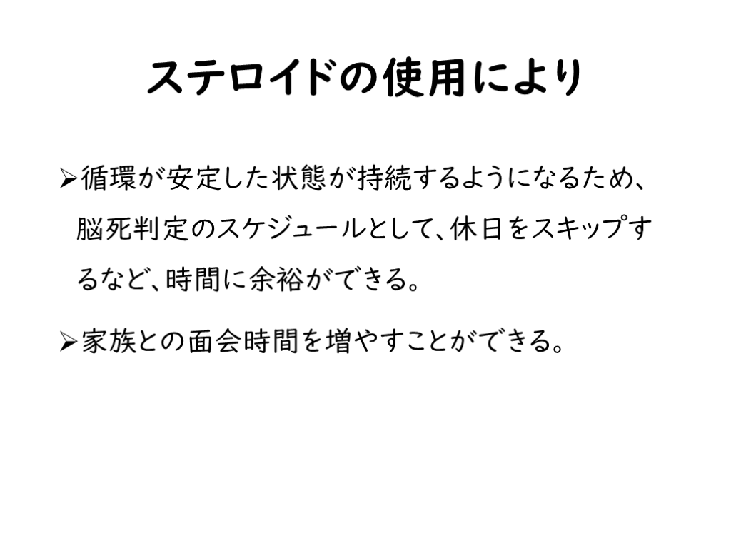 #39. ステロイドの使用により 循環が安定した状態が持続するようになるため、脳死判定のスケジュールとして、休日をスキップするなど、時間に余裕ができる。