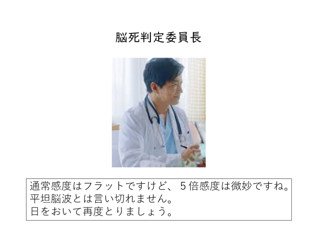 通常感度では平坦脳波でも、5倍感度で微細ながらも無視できない波が存在し、脳死とされうる状態となかなか判定できないことが多い。