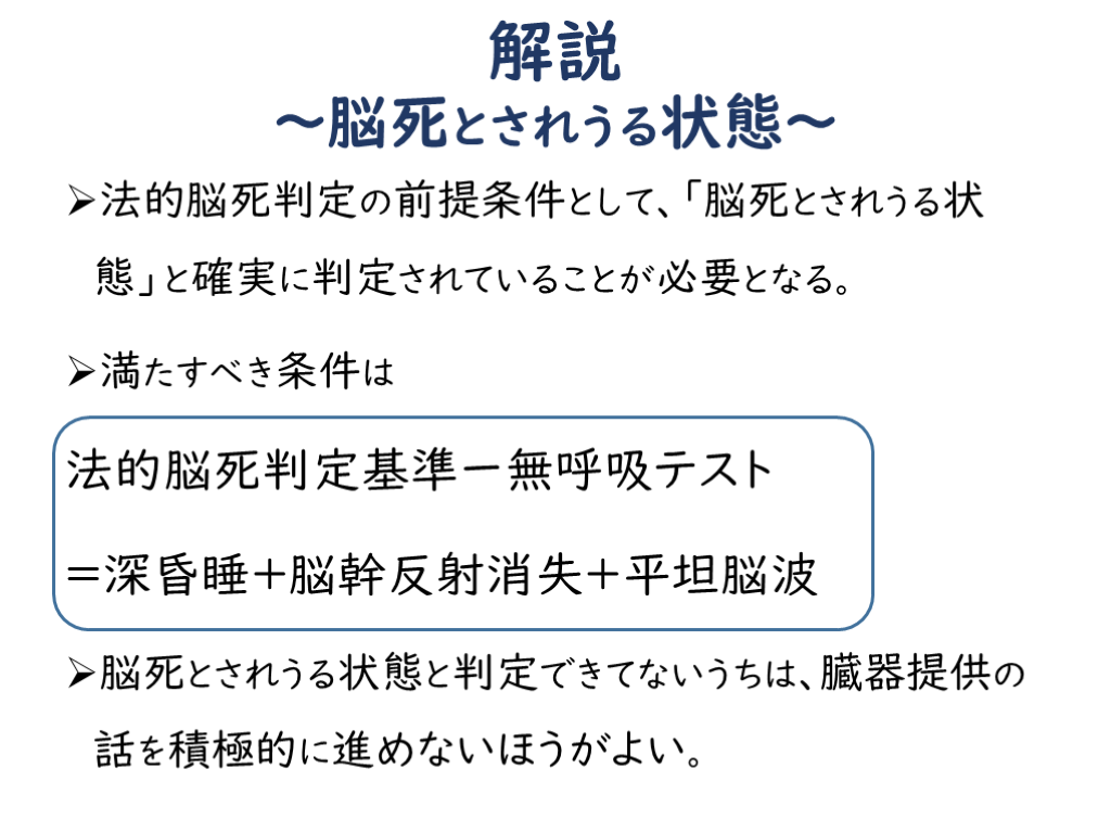 #51. 解説~脳死とされうる状態~ 法的脳死判定の前提条件として、「脳死とされうる状態」と確実に判定されていることが必要となる。