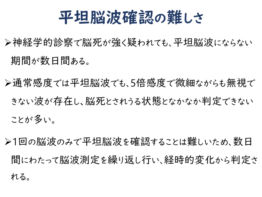 #52. 平坦脳波確認の難しさ 神経学的診察で脳死が強く疑われても、平坦脳波にならない期間が数日間ある。