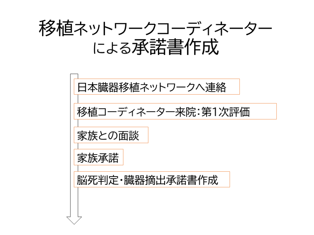#57. 移植ネットワークコーディネーターによる承諾書作成 日本臓器移植ネットワークへ連絡 移植コーディネーター来院:第1次評価 家族との面談 家族承諾 脳死判定・臓器摘出承諾書作成