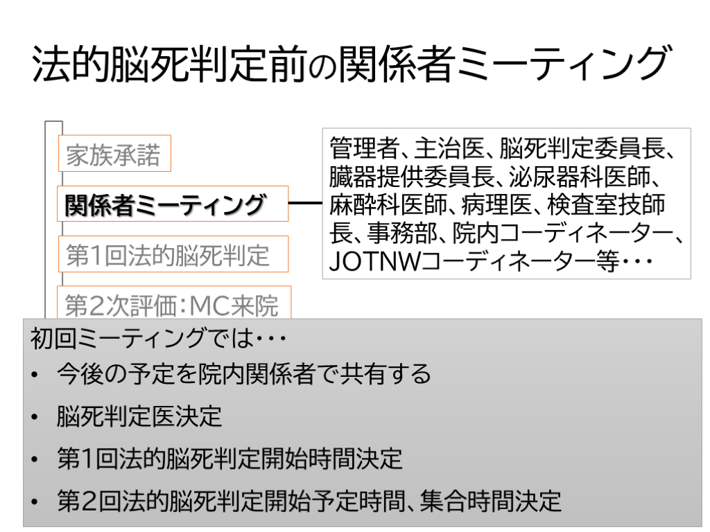 #58. 法的脳死判定前の関係者ミーティング 家族承諾 第2回法的脳死判定 第2次評価:MC来院 関係者ミーティング 第1回法的脳死判定 終了時刻=死亡確認 管理者、主治医、脳死判定委員長、臓器提供委員長、泌尿器科医師、麻酔科医師、病理医、検査室技師長、事務部、院内コーディネーター、