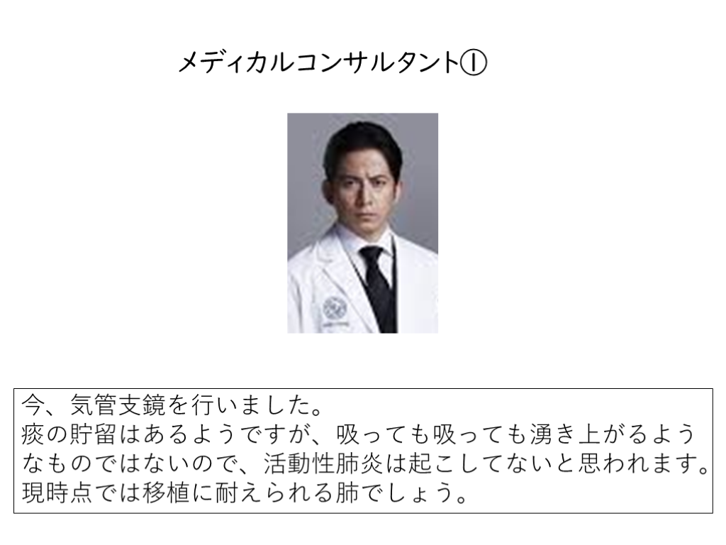 痰の貯留はあるようですが、吸っても吸っても湧き上がるようなものではないので、活動性肺炎は起こしてないと思われます。現時点では移植に耐えられる肺でしょう。