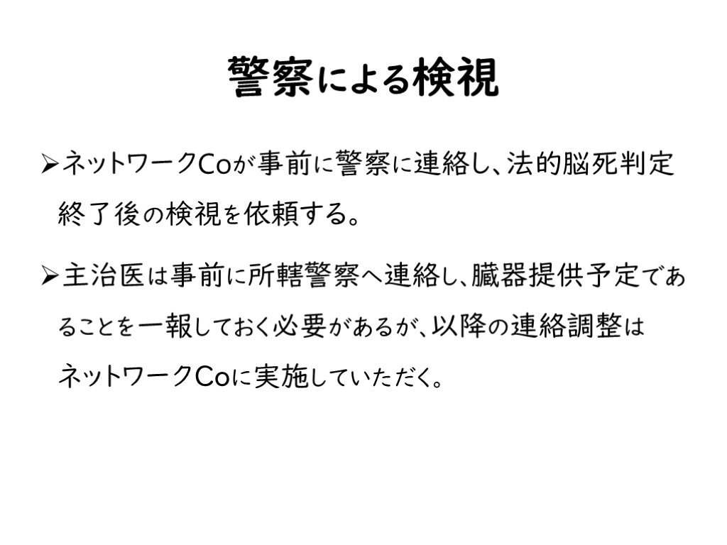 主治医は事前に所轄警察へ連絡し、臓器提供予定であることを一報しておく必要があるが、以降の連絡調整はネットワークCoに実施していただく。