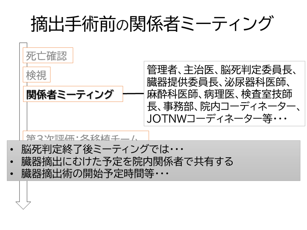 臓器摘出術の開始予定時間等・・・ 管理者、主治医、脳死判定委員長、臓器提供委員長、泌尿器科医師、麻酔科医師、病理医、検査室技師長、事務部、院内コーディネーター、JOTNWコーディネーター等・・・