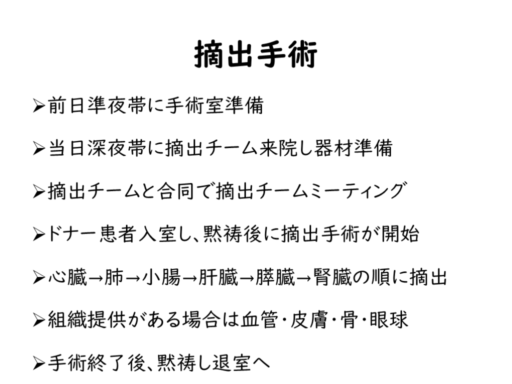 #72. 摘出手術前の関係者ミーティング 死亡確認 手術室出棟 検視 関係者ミーティング 手術室ミーティング 第3次評価:各移植チーム 脳死判定終了後ミーティングでは・・・