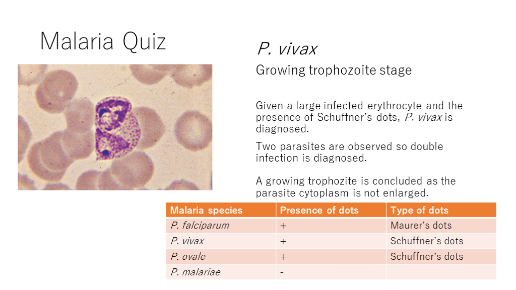 Given a large infected erythrocyte and the presence of Schuffner’s dots, P. vivax is diagnosed.