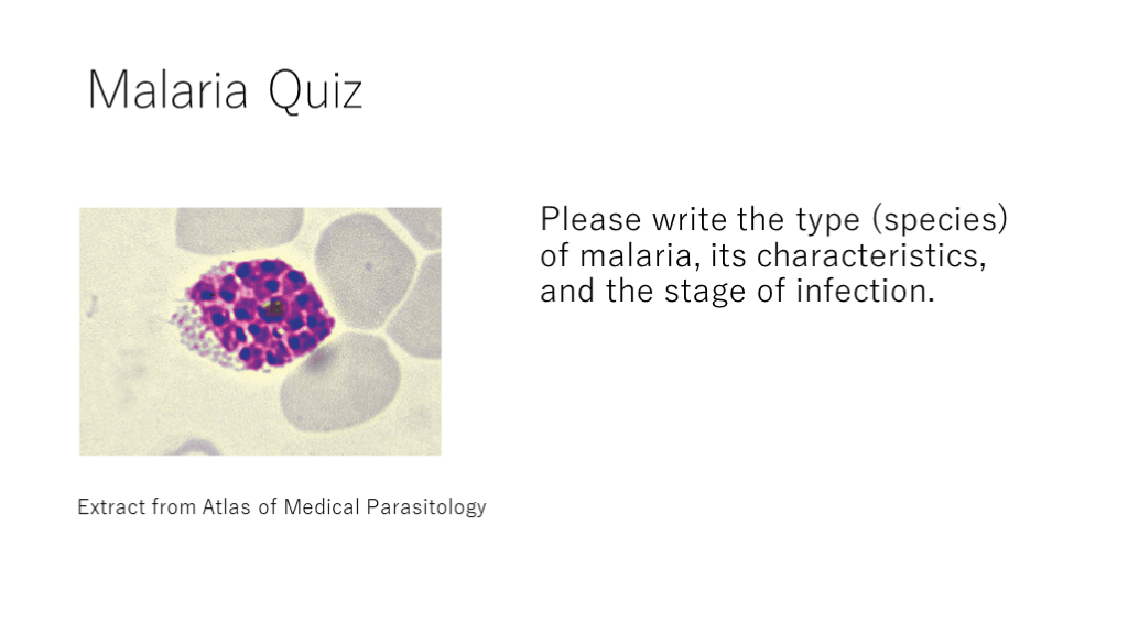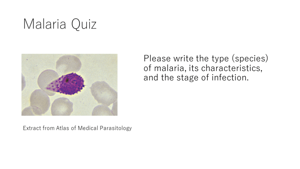 #7. Malaria Quiz Please write the type (species) of malaria, its characteristics, and the stage of infection.