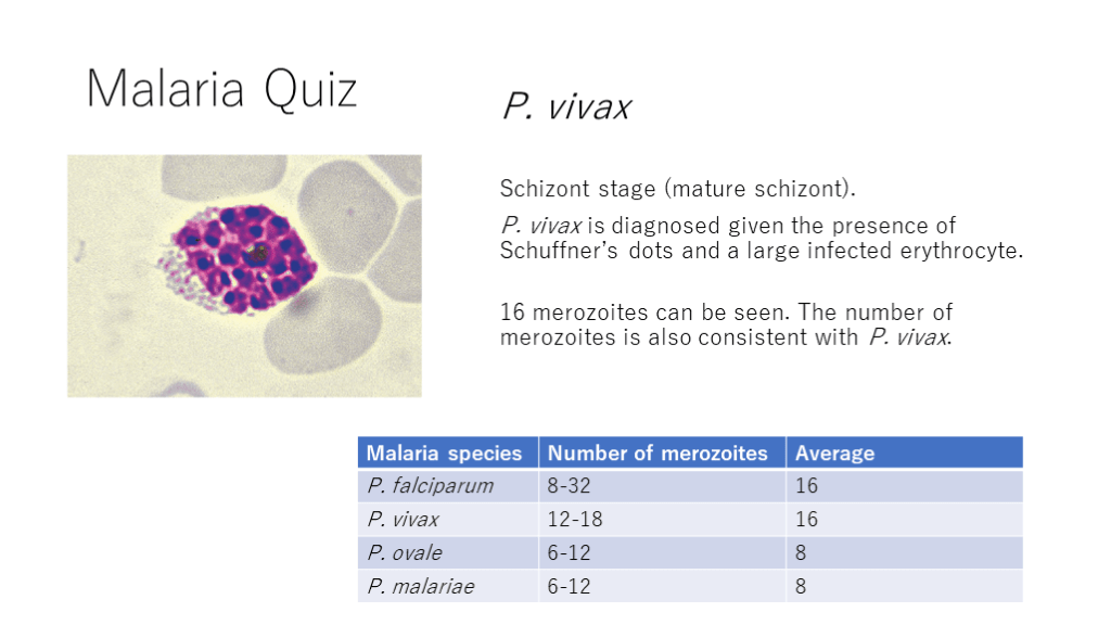 16 merozoites can be seen. The number of merozoites is also consistent with P. vivax.