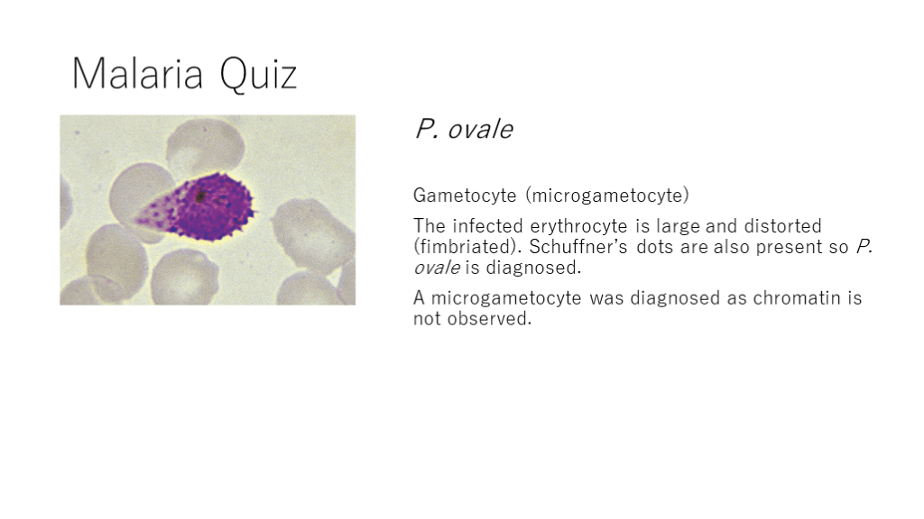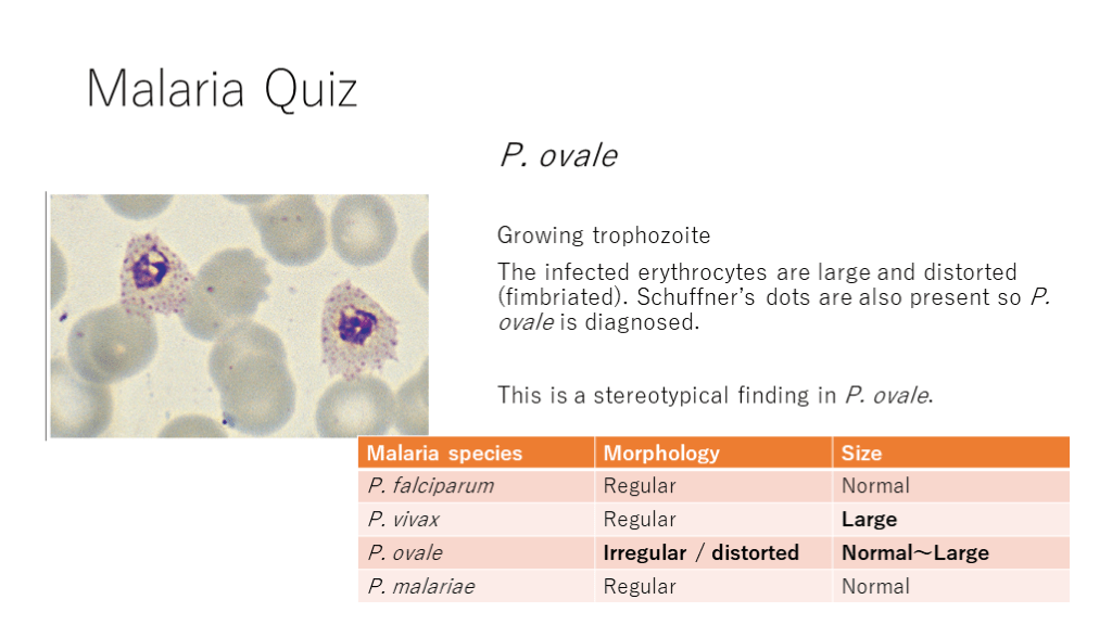 The infected erythrocytes are large and distorted (fimbriated). Schuffner’s dots are also present so P. ovale is diagnosed.