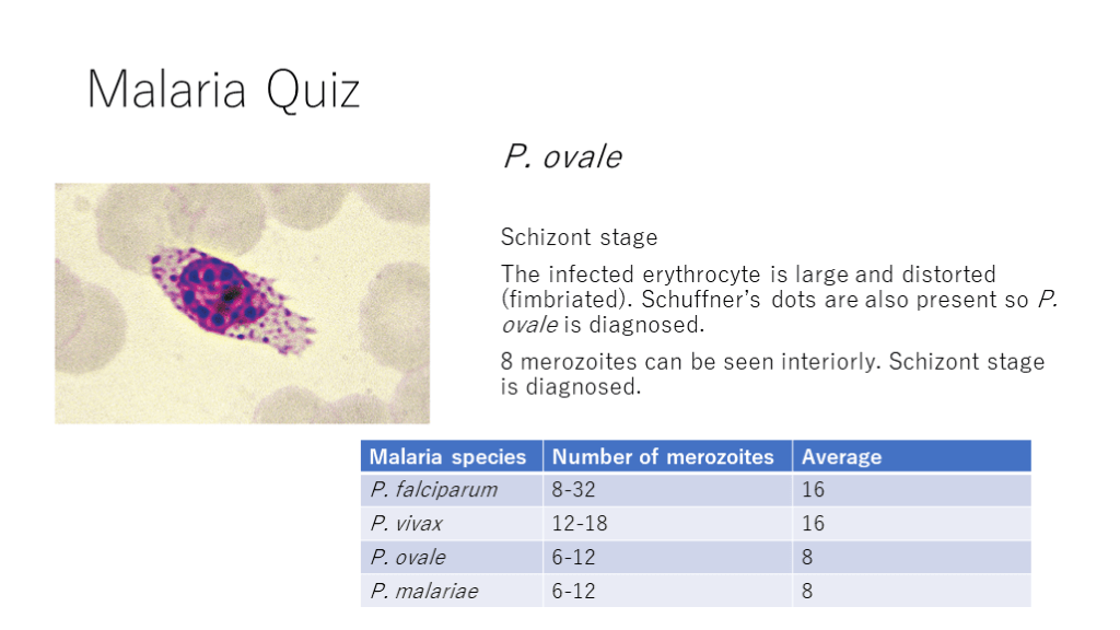 The infected erythrocyte is large and distorted (fimbriated). Schuffner’s dots are also present so P. ovale is diagnosed.