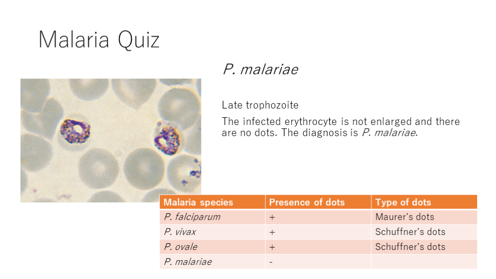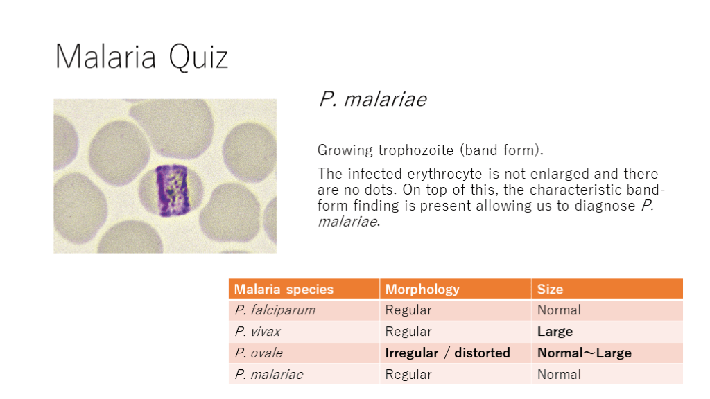 The infected erythrocyte is not enlarged and there are no dots. On top of this, the characteristic band-form finding is present allowing us to diagnose P. malariae.