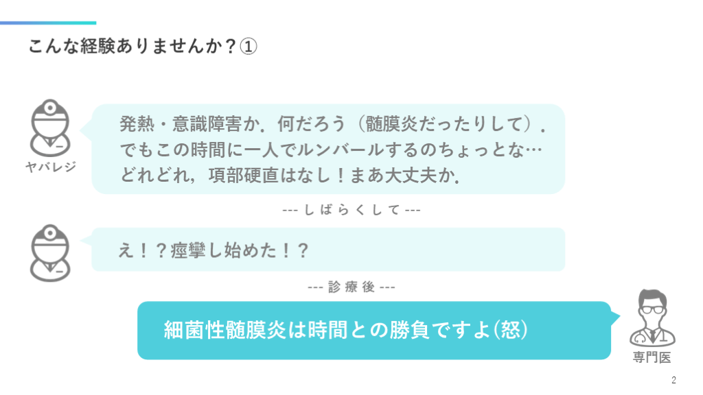#3. こんな経験ありませんか?① 2 発熱・意識障害か.何だろう(髄膜炎だったりして).