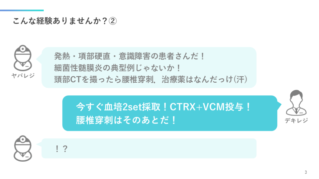 頭部CTを撮ったら腰椎穿刺.治療薬はなんだっけ(汗) ヤバレジ !? 今すぐ血培2set採取!CTRX+VCM投与!