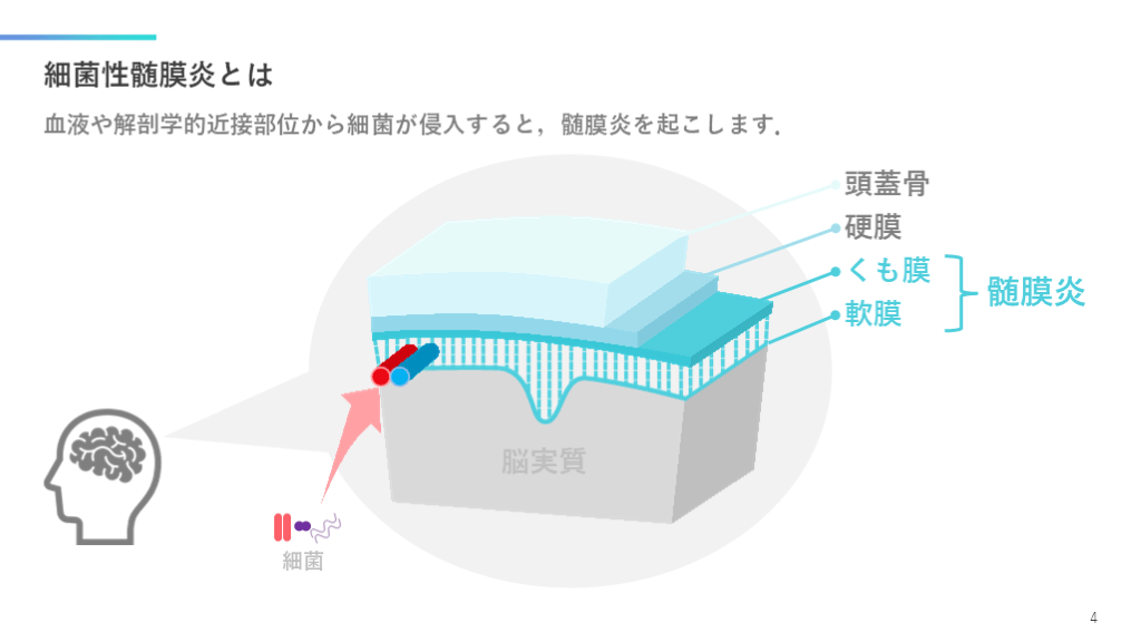 #5. 血液や解剖学的近接部位から細菌が侵入すると,髄膜炎を起こします. 4 細菌性髄膜炎とは 頭蓋骨 硬膜 くも膜 軟膜 髄膜炎 脳実質 細菌