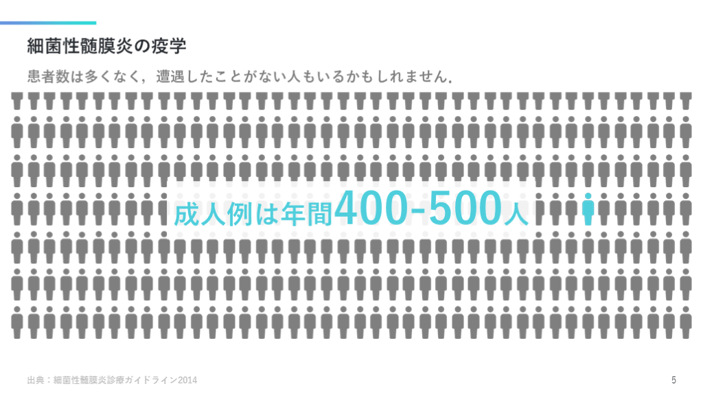 #6. 患者数は多くなく,遭遇したことがない人もいるかもしれません. 出典:細菌性髄膜炎診療ガイドライン2014 5 細菌性髄膜炎の疫学 成人例は年間400-500人