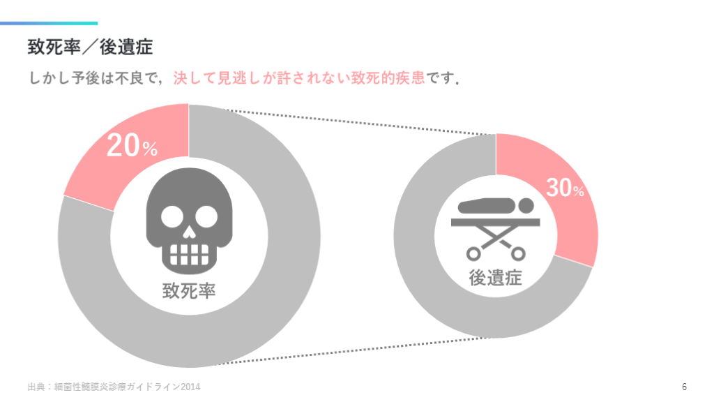 #7. 致死率/後遺症 しかし予後は不良で,決して見逃しが許されない致死的疾患です. 出典:細菌性髄膜炎診療ガイドライン2014 6 20% 30% 致死率 後遺症