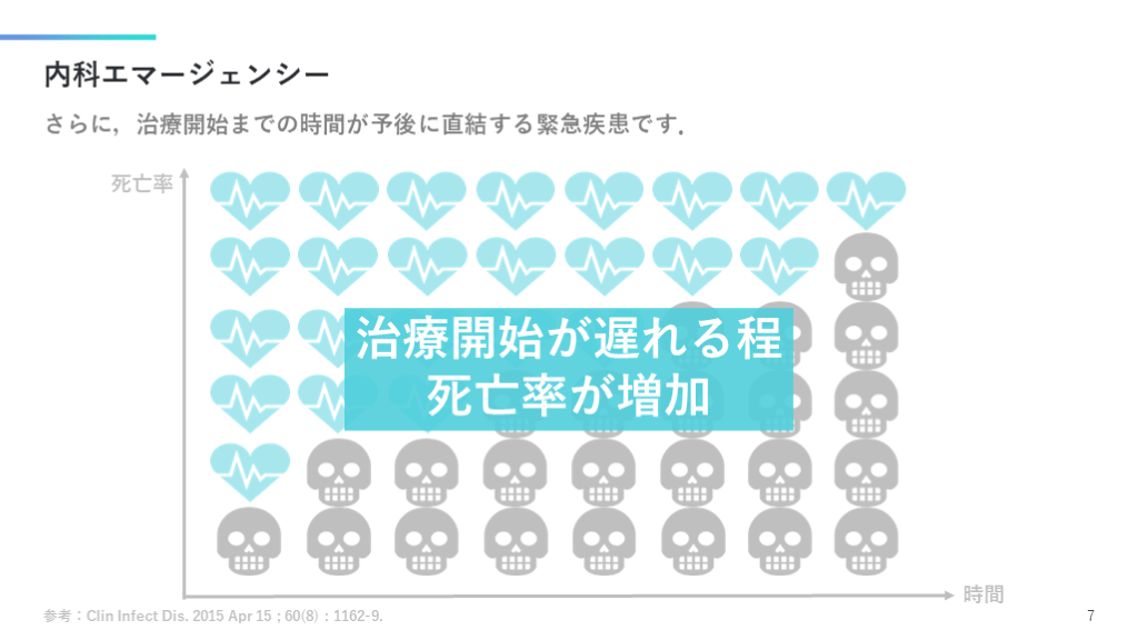 #8. さらに,治療開始までの時間が予後に直結する緊急疾患です. 参考:Clin Infect Dis. 2015 Apr 15 ; 60(8) : 1162-9. 7 内科エマージェンシー 治療開始が遅れる程