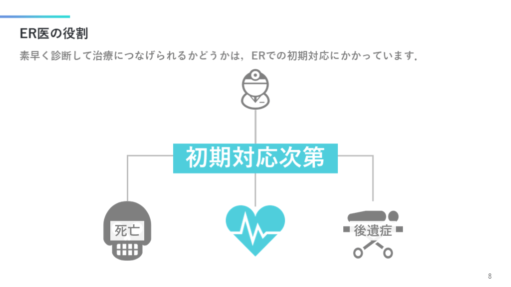 #9. ER医の役割 素早く診断して治療につなげられるかどうかは,ERでの初期対応にかかっています. 8 初期対応次第 後遺症 死亡
