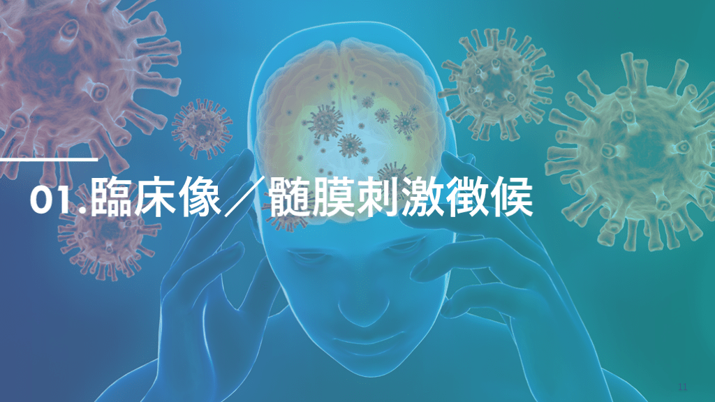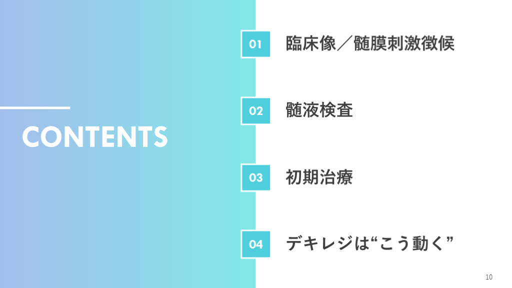 #11. CONTENTS 10 臨床像/髄膜刺激徴候 髄液検査 初期治療 デキレジは“こう動く” 01 02 03 04