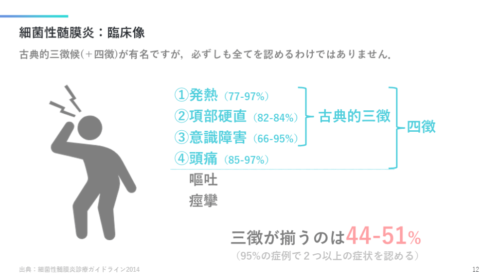 #13. 古典的三徴候(+四徴)が有名ですが,必ずしも全てを認めるわけではありません. 出典:細菌性髄膜炎診療ガイドライン2014 12 細菌性髄膜炎:臨床像 三徴が揃うのは44-51%