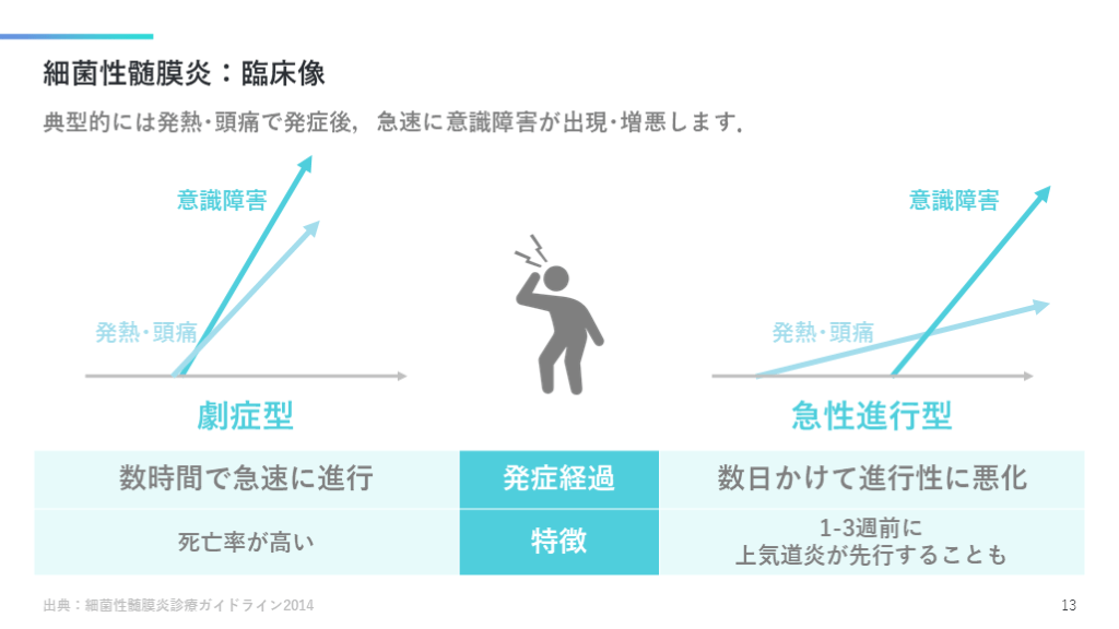 #14. 細菌性髄膜炎:臨床像 典型的には発熱・頭痛で発症後,急速に意識障害が出現・増悪します. 出典:細菌性髄膜炎診療ガイドライン2014 13 発熱・頭痛 発熱・頭痛 意識障害 意識障害