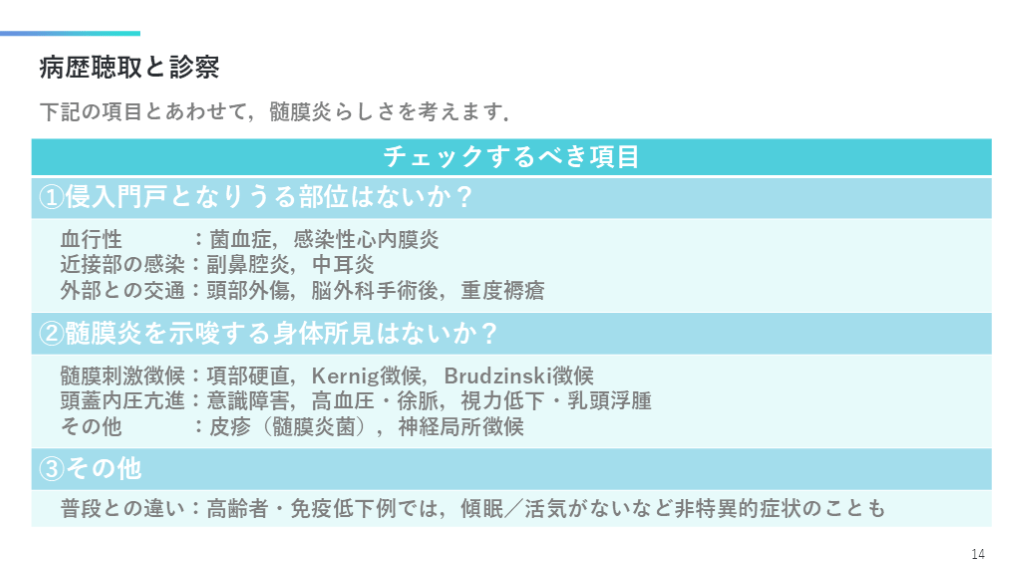 #15. 下記の項目とあわせて,髄膜炎らしさを考えます. 14 病歴聴取と診察