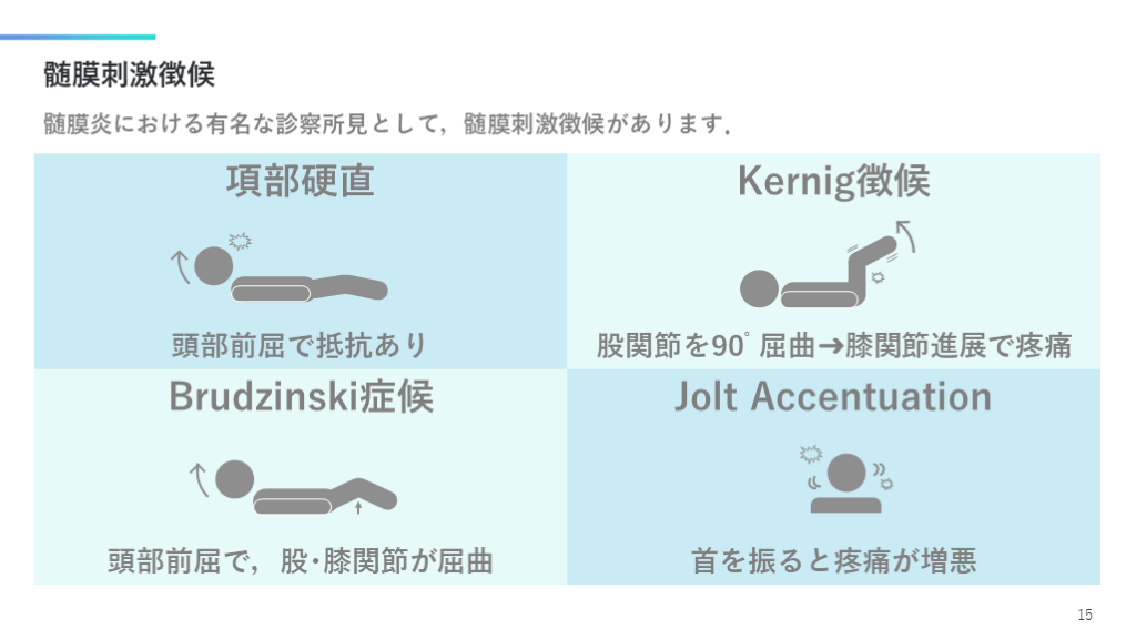 #16. 髄膜炎における有名な診察所見として,髄膜刺激徴候があります. 15 髄膜刺激徴候