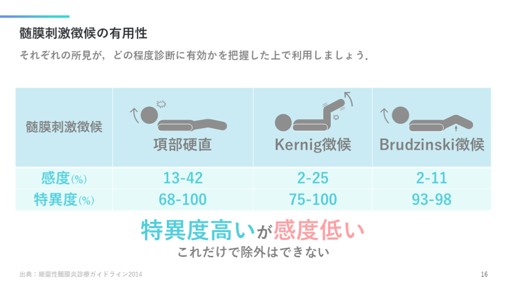 #17. 髄膜刺激徴候の有用性 それぞれの所見が,どの程度診断に有効かを把握した上で利用しましょう. 出典:細菌性髄膜炎診療ガイドライン2014 16 特異度高いが感度低い