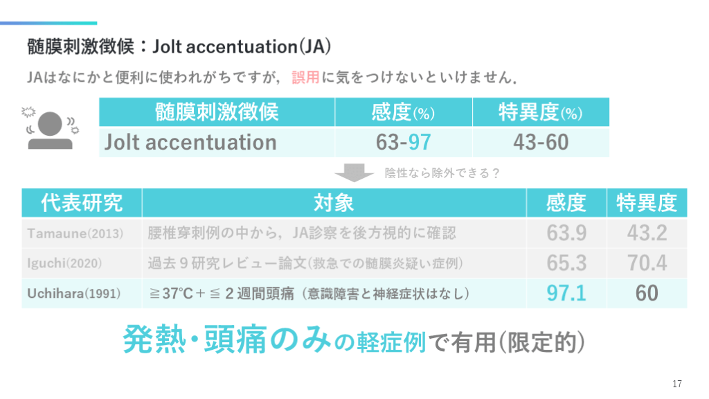 #18. 髄膜刺激徴候:Jolt accentuation(JA) JAはなにかと便利に使われがちですが,誤用に気をつけないといけません. 17 発熱・頭痛のみの軽症例で有用(限定的) 陰性なら除外できる?