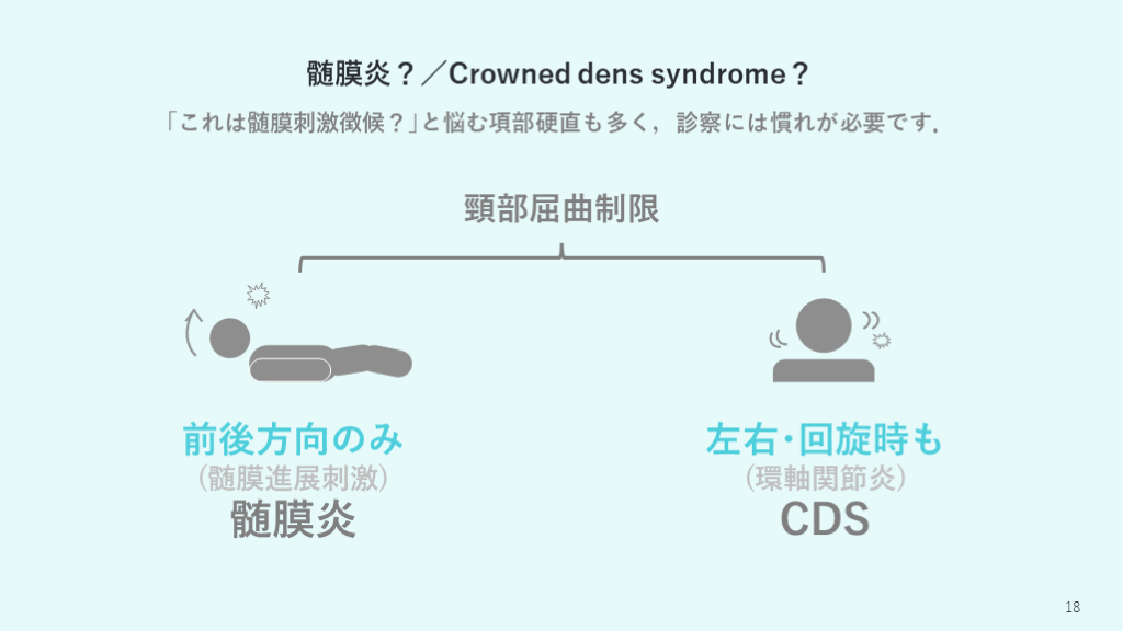 #19. 髄膜炎?/Crowned dens syndrome? 「これは髄膜刺激徴候?」と悩む項部硬直も多く,診察には慣れが必要です. 18 頸部屈曲制限 前後方向のみ