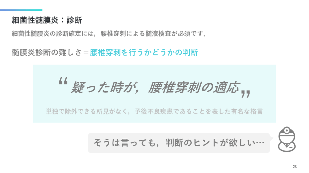 #21. 細菌性髄膜炎:診断 細菌性髄膜炎の診断確定には,腰椎穿刺による髄液検査が必須です. 20 疑った時が,腰椎穿刺の適応 “ ” 単独で除外できる所見がなく,予後不良疾患であることを表した有名な格言 そうは言っても,判断のヒントが欲しい… 髄膜炎診断の難しさ=腰椎穿刺を行うかどうかの判断
