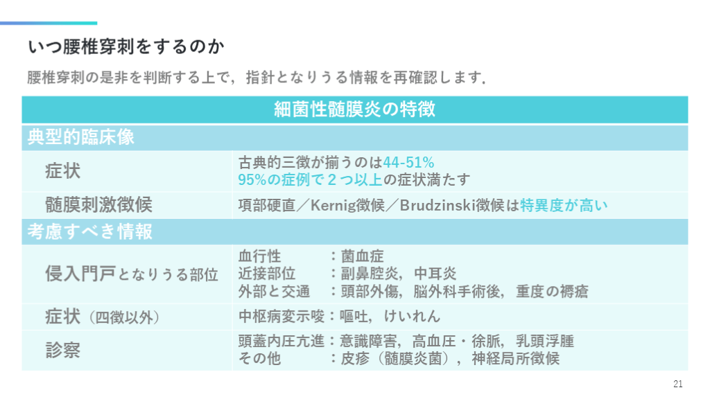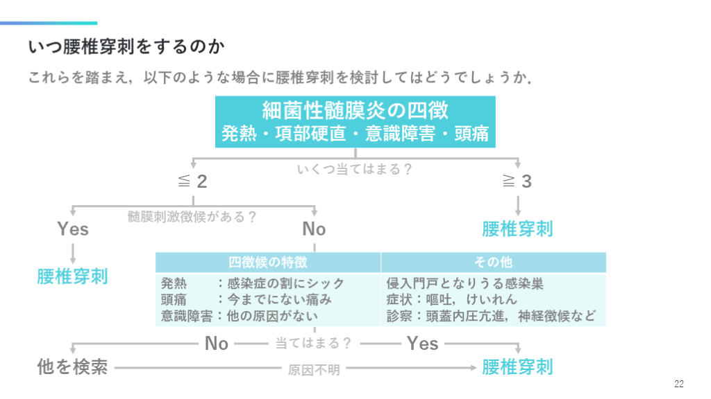 #22. いつ腰椎穿刺をするのか 腰椎穿刺の是非を判断する上で,指針となりうる情報を再確認します. 21