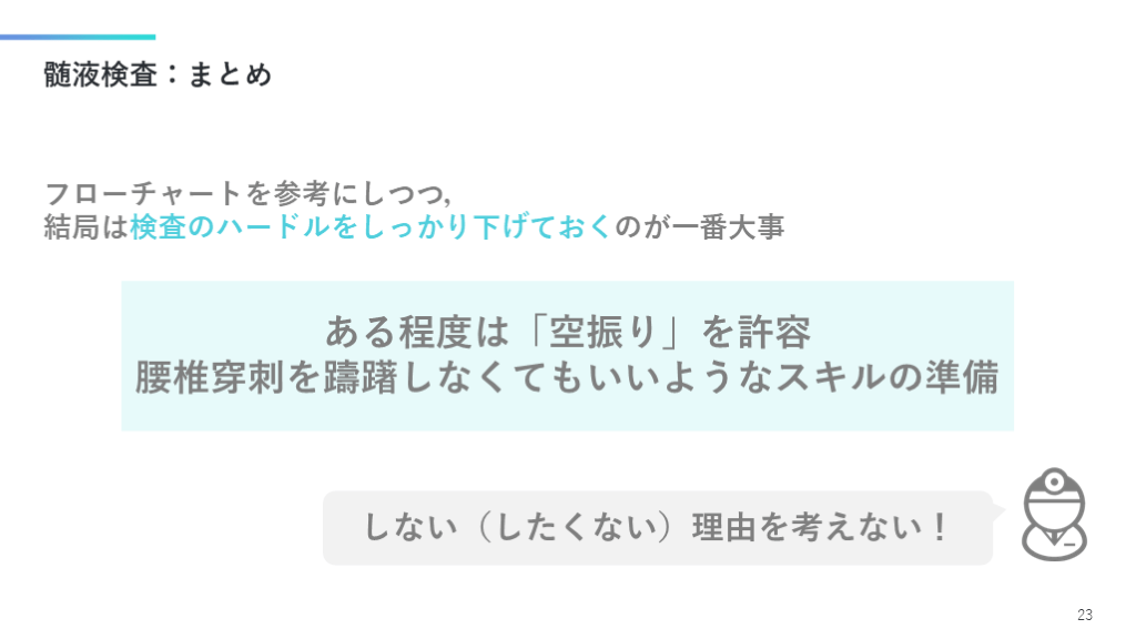 #24. 髄液検査:まとめ 23 しない(したくない)理由を考えない! ある程度は「空振り」を許容