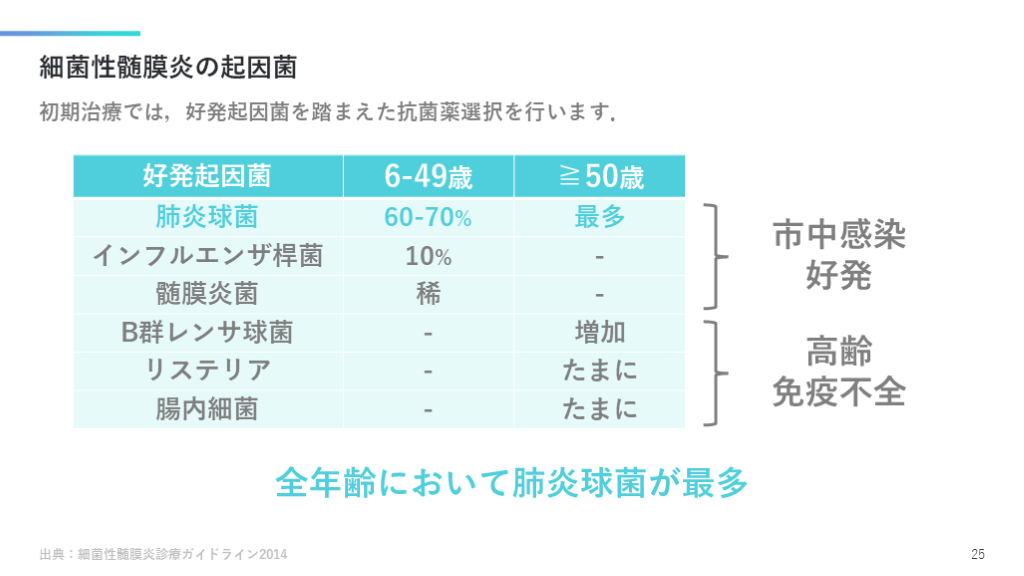 #26. 初期治療では,好発起因菌を踏まえた抗菌薬選択を行います. 出典:細菌性髄膜炎診療ガイドライン2014 25 細菌性髄膜炎の起因菌 市中感染