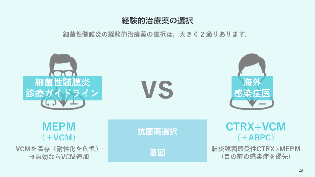 #29. 経験的治療薬の選択 細菌性髄膜炎の経験的治療薬の選択は,大きく2通りあります. 28 vs 細菌性髄膜炎