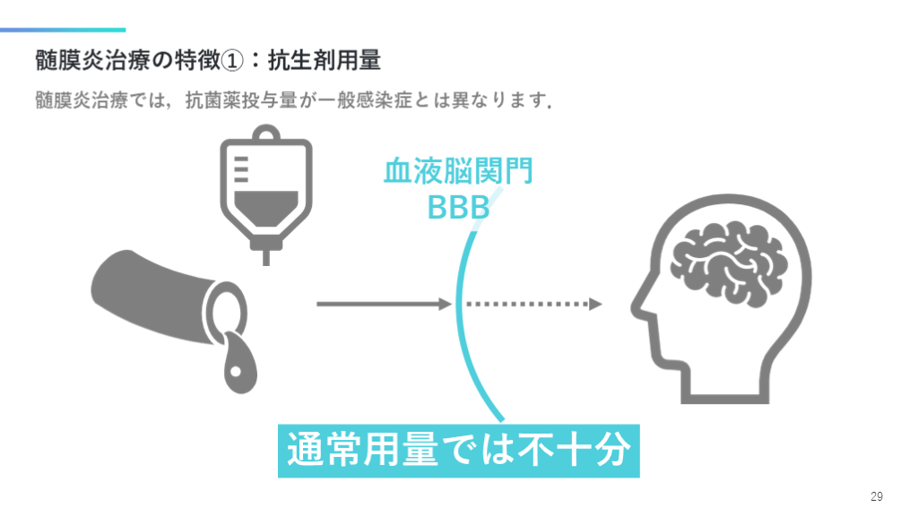 #30. 髄膜炎治療では,抗菌薬投与量が一般感染症とは異なります. 29 髄膜炎治療の特徴①:抗生剤用量 血液脳関門