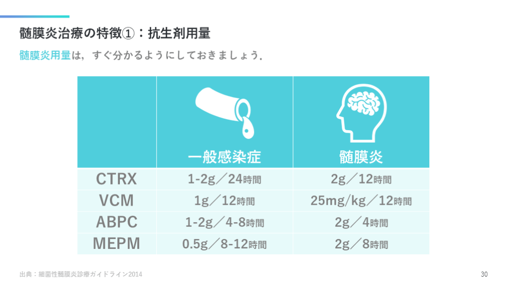 #31. 髄膜炎用量は,すぐ分かるようにしておきましょう. 出典:細菌性髄膜炎診療ガイドライン2014 30 髄膜炎治療の特徴①:抗生剤用量