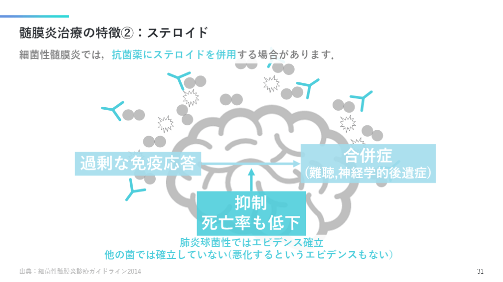 #32. 出典:細菌性髄膜炎診療ガイドライン2014 31 髄膜炎治療の特徴②:ステロイド 過剰な免疫応答 肺炎球菌性ではエビデンス確立