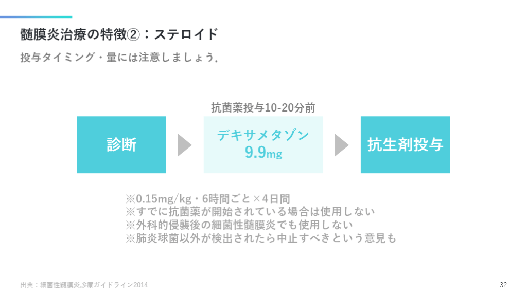 9.9mg 投与タイミング・量には注意しましょう. 出典:細菌性髄膜炎診療ガイドライン2014 32 髄膜炎治療の特徴②:ステロイド ※0.15mg/kg・6時間ごと×4日間