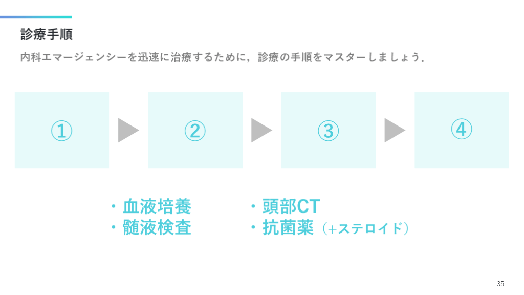 #36. 内科エマージェンシーを迅速に治療するために,診療の手順をマスターしましょう. 35 診療手順 ① ② ③ ④ ・血液培養 ・頭部CT