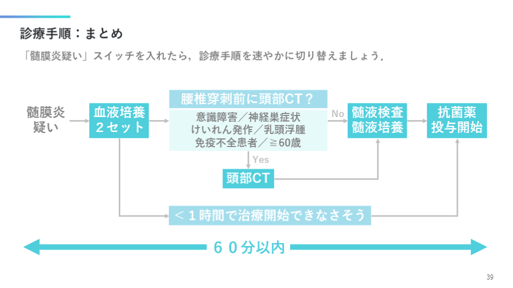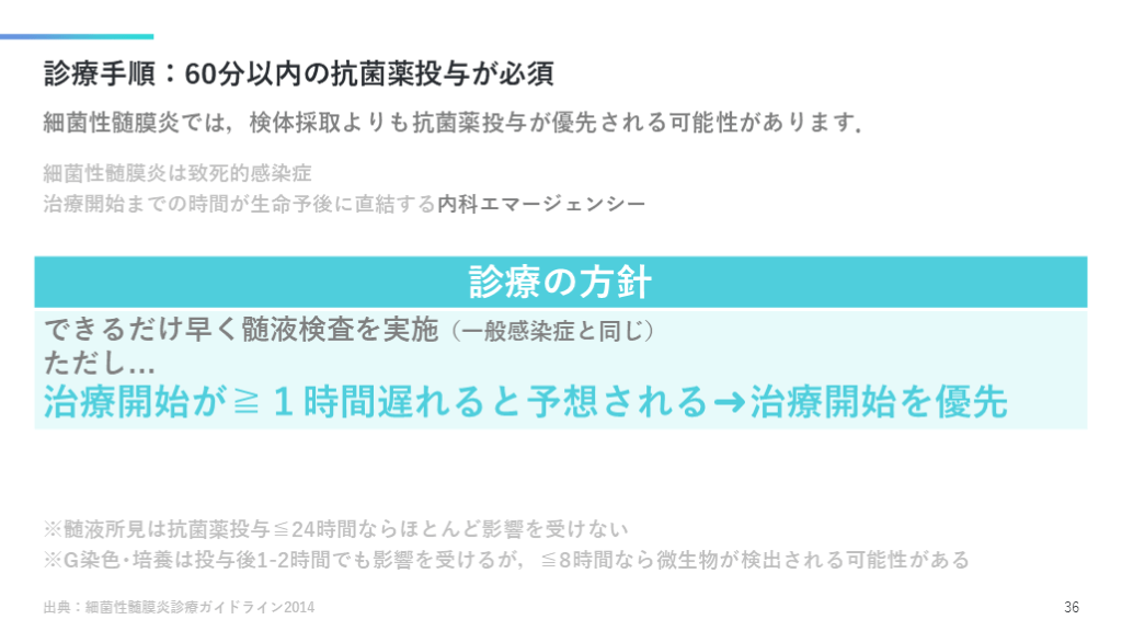 #37. 診療手順:60分以内の抗菌薬投与が必須 細菌性髄膜炎では,検体採取よりも抗菌薬投与が優先される可能性があります. 出典:細菌性髄膜炎診療ガイドライン2014 36 細菌性髄膜炎は致死的感染症