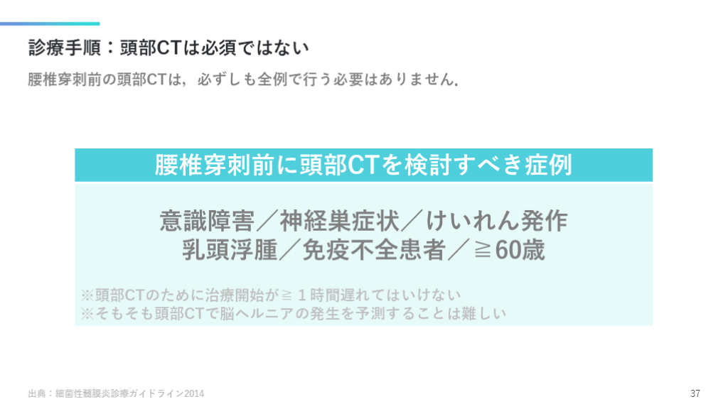 #38. 診療手順:頭部CTは必須ではない 腰椎穿刺前の頭部CTは,必ずしも全例で行う必要はありません. 出典:細菌性髄膜炎診療ガイドライン2014 37