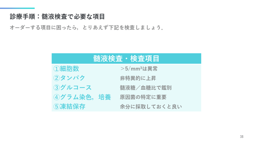 #39. 診療手順:髄液検査で必要な項目 オーダーする項目に困ったら,とりあえず下記を検査しましょう. 38