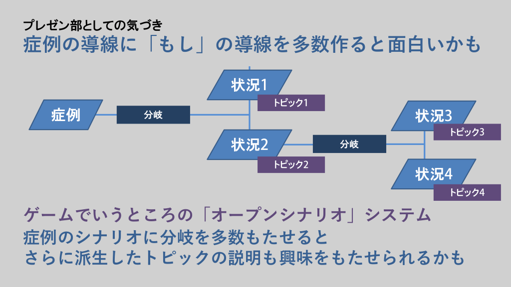 #10. プレゼン部としての気づき 症例の導線に「もし」の導線を多数作ると面白いかも 状況 症例 トピック 状況 分岐 トピック 状況 分岐 トピック 状況 トピック ゲームでいうところの「オープンシナリオ」システム 症例のシナリオに分岐を多数もたせると さらに派生したトピックの説明も興味をもたせられるかも