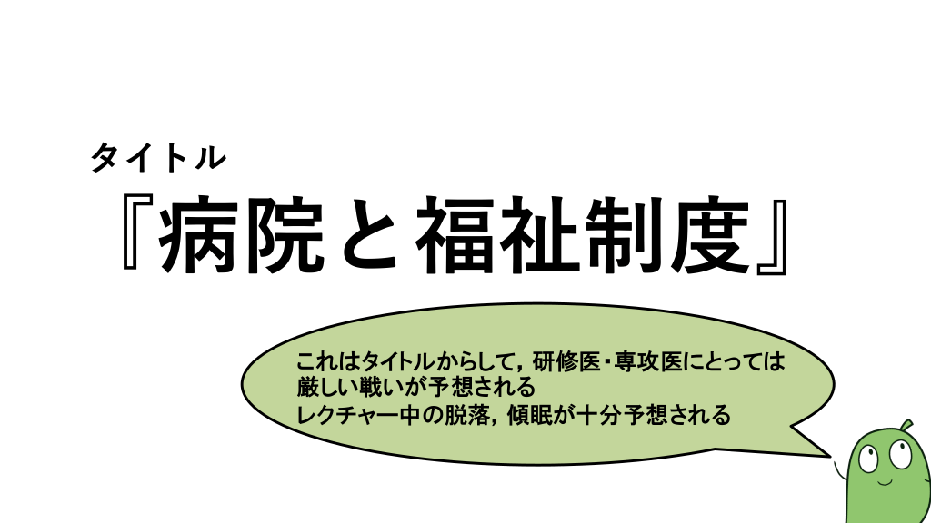 #2. タイトル 『病院と福祉制度』 これはタイトルからして,研修医・専攻医にとっては 厳しい戦いが予想される レクチャー中の脱落,傾眠が十分予想される