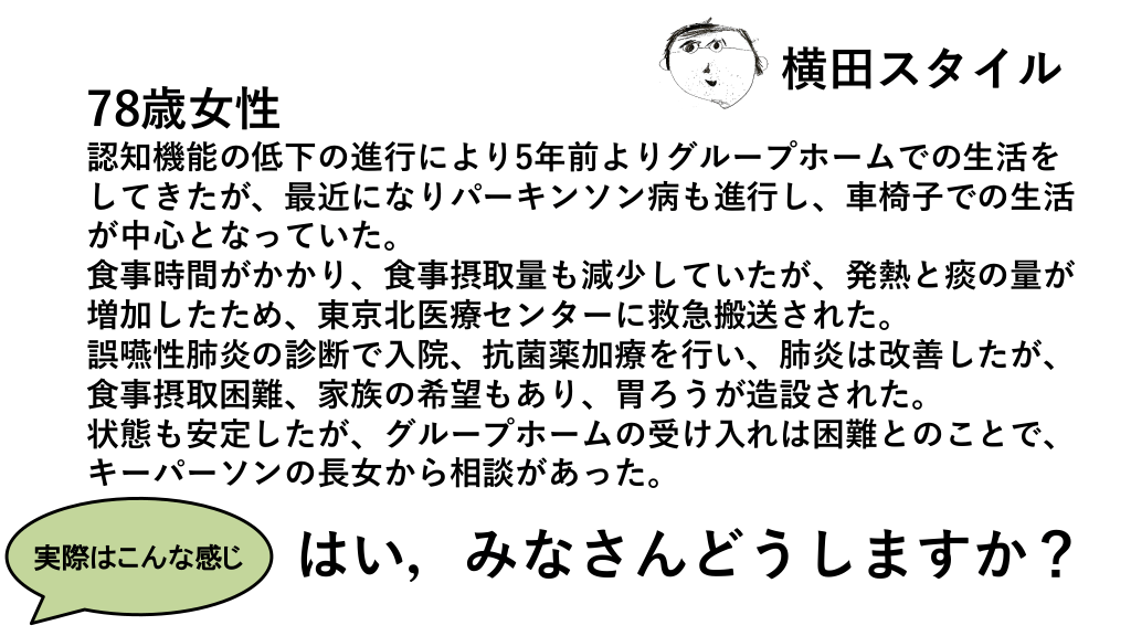 #4. 78歳女性 横田スタイル 認知機能の低下の進行により5年前よりグループホームでの生活を してきたが、最近になりパーキンソン病も進行し、車椅子での生活 が中心となっていた。 食事時間がかかり、食事摂取量も減少していたが、発熱と痰の量が 増加したため、東京北医療センターに救急搬送された。 誤嚥性肺炎の診断で入院、抗菌薬加療を行い、肺炎は改善したが、 食事摂取困難、家族の希望もあり、胃ろうが造設された。 状態も安定したが、グループホームの受け入れは困難とのことで、 キーパーソンの長女から相談があった。 実際はこんな感じ はい,みなさんどうしますか?