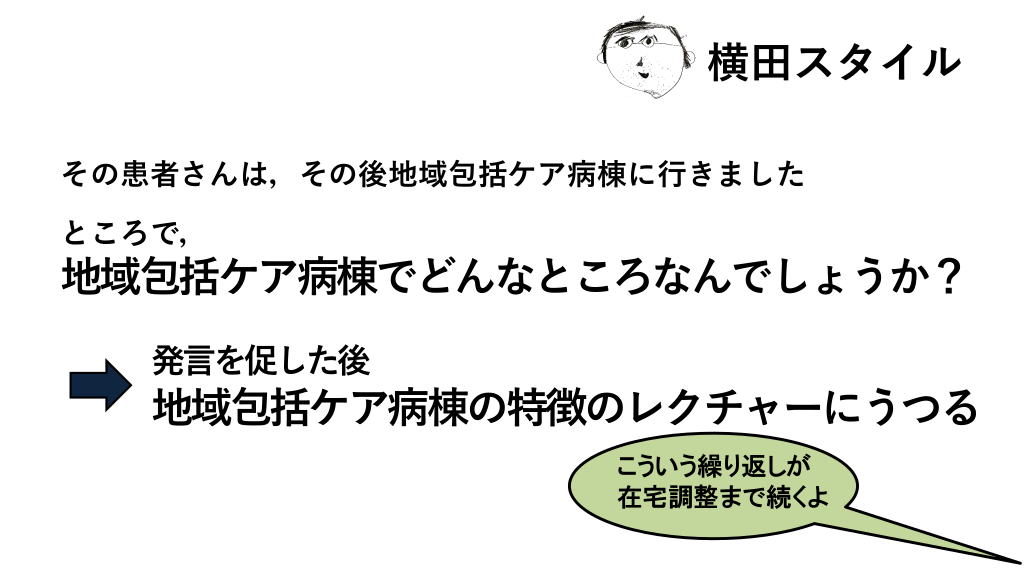 #6. 横田スタイル その患者さんは,その後地域包括ケア病棟に行きました ところで, 地域包括ケア病棟でどんなところなんでしょうか? 発言を促した後 地域包括ケア病棟の特徴のレクチャーにうつる こういう繰り返しが 在宅調整まで続くよ