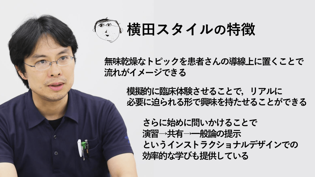 #8. 横田スタイルの特徴 無味乾燥なトピックを患者さんの導線上に置くことで 流れがイメージできる 模擬的に臨床体験させることで,リアルに 必要に迫られる形で興味を持たせることができる さらに始めに問いかけることで 演習→共有→一般論の提示 というインストラクショナルデザインでの 効率的な学びも提供している