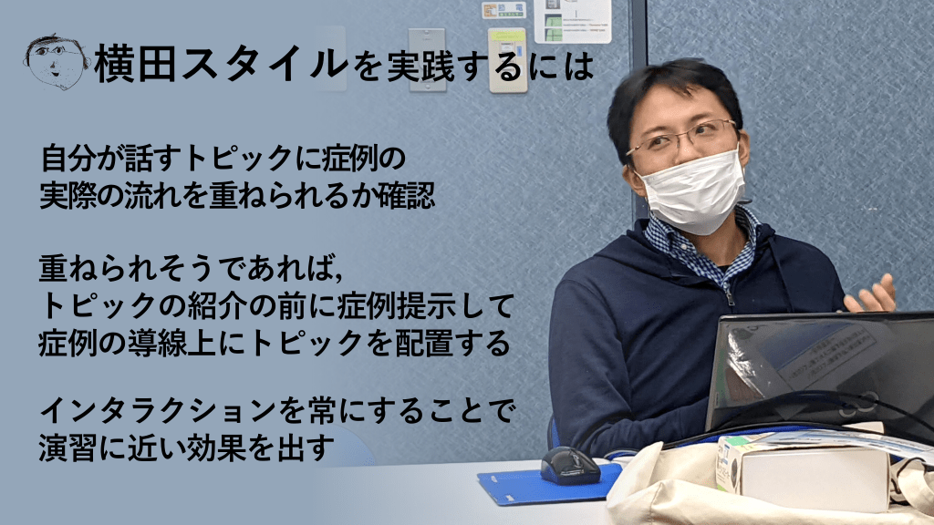 #9. 横田スタイルを実践するには 自分が話すトピックに症例の 実際の流れを重ねられるか確認 重ねられそうであれば, トピックの紹介の前に症例提示して 症例の導線上にトピックを配置する インタラクションを常にすることで 演習に近い効果を出す